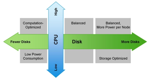 - Compute Intensive Configuration (2U/machine): Two hex-core CPUs, 64-512GB memory, and 4-8 disk drives (1TB or 2TB)